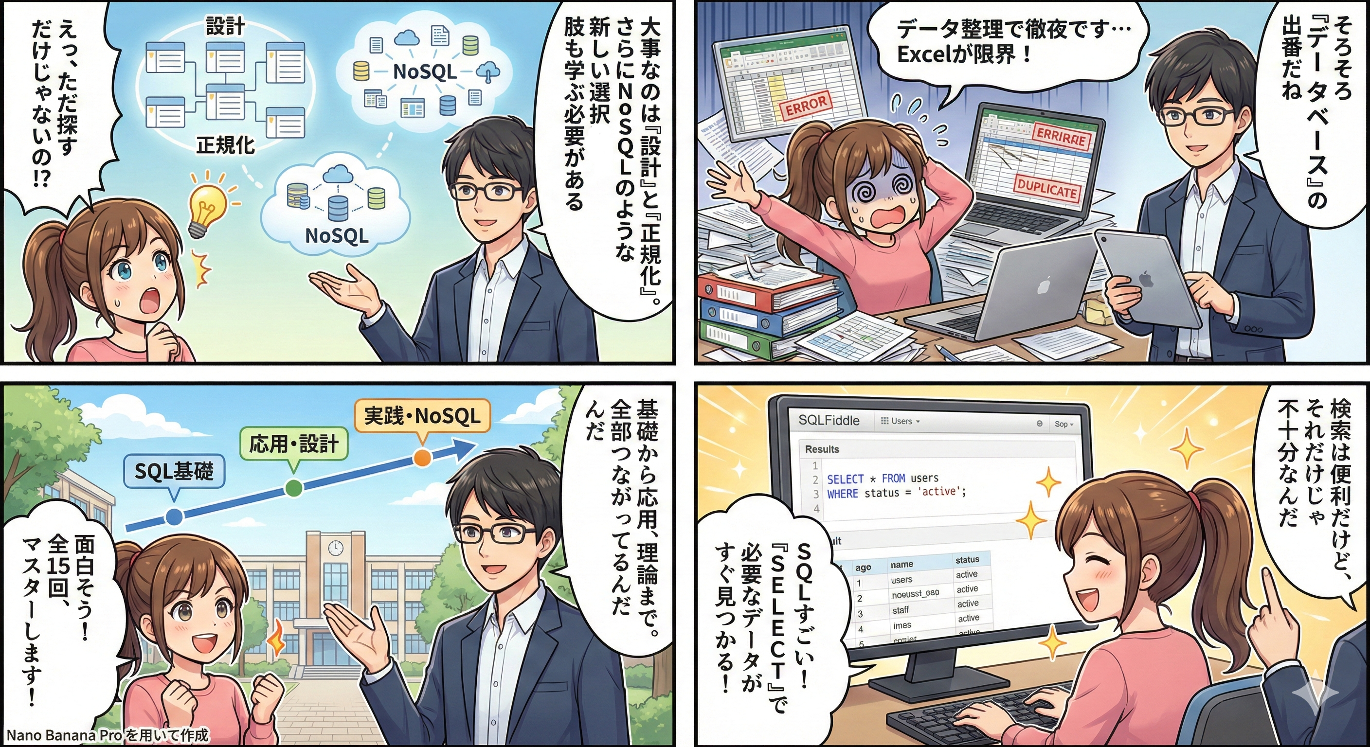 データベースの基本概念を学んだ後、SQLFiddleを活用してSQLの文法とSELECT文によるデータ検索の基礎を習得する。
