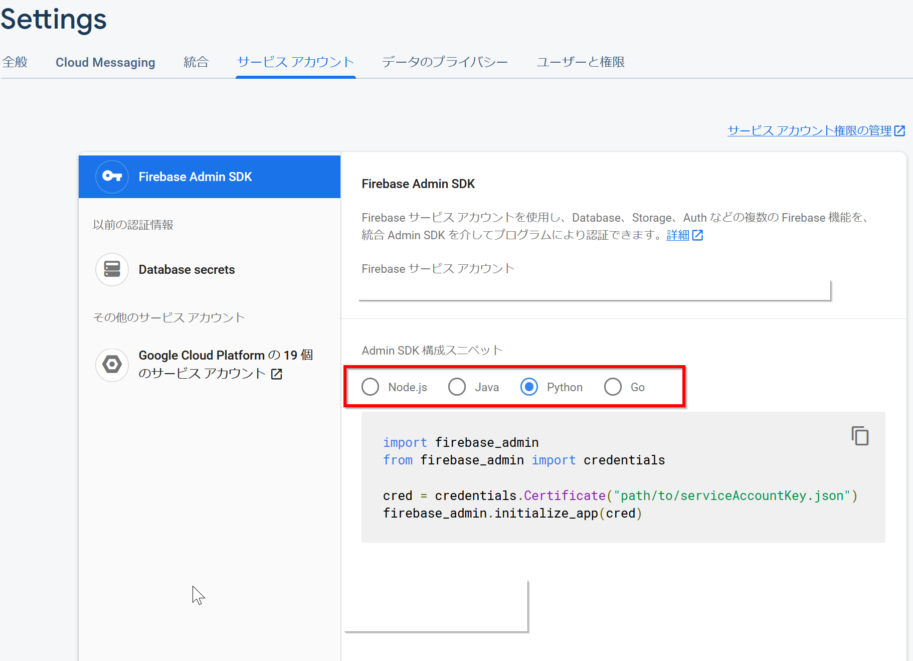 - 「Cloud Firestore」または「Realtime Database」から使用中のデータベースを選択する