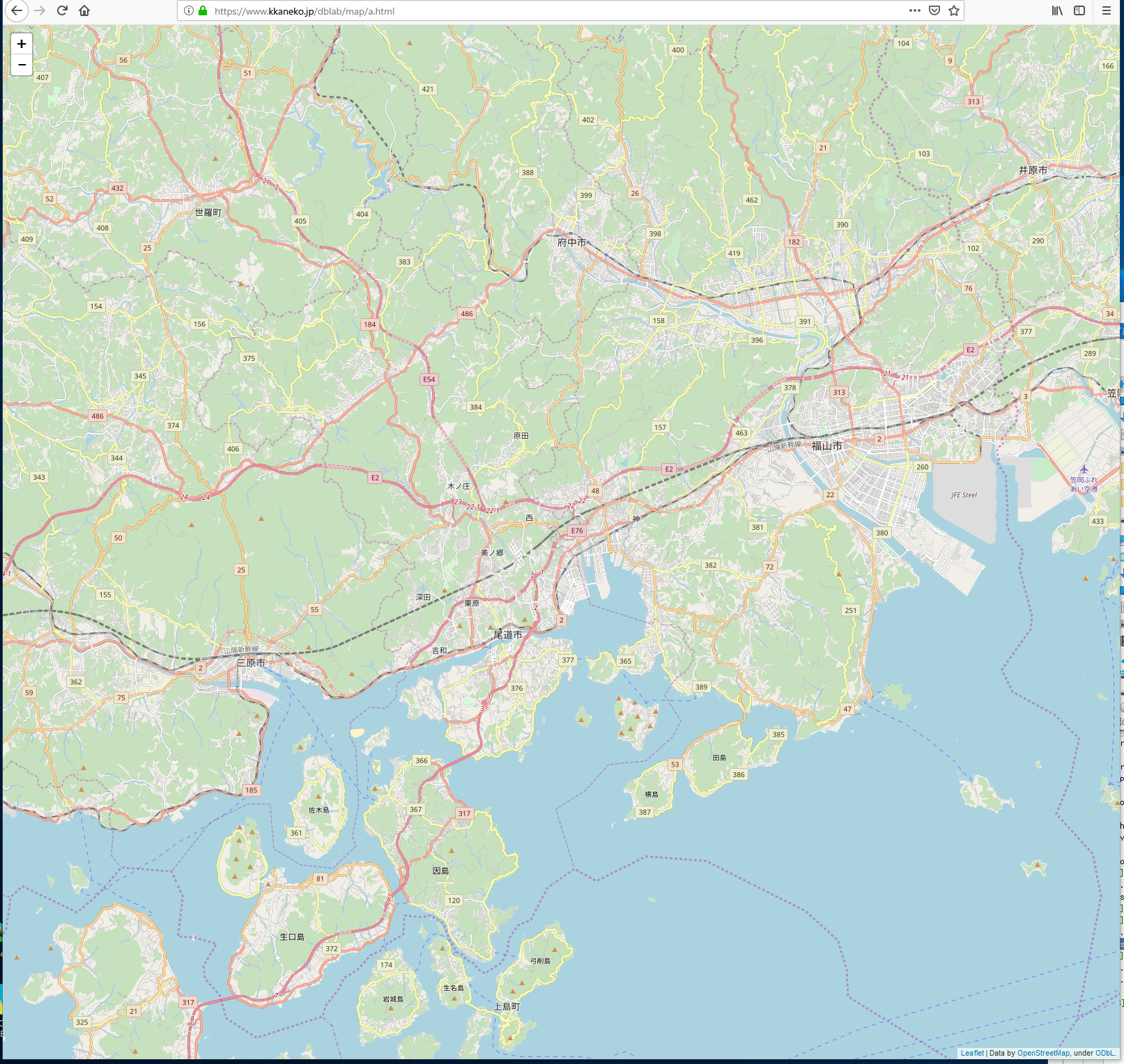 a.html をウェブブラウザで開く | 緯度経度 34.4461, 133.2315 付近の OpenStreetMap 地図がズームレベル 12 で表示される |