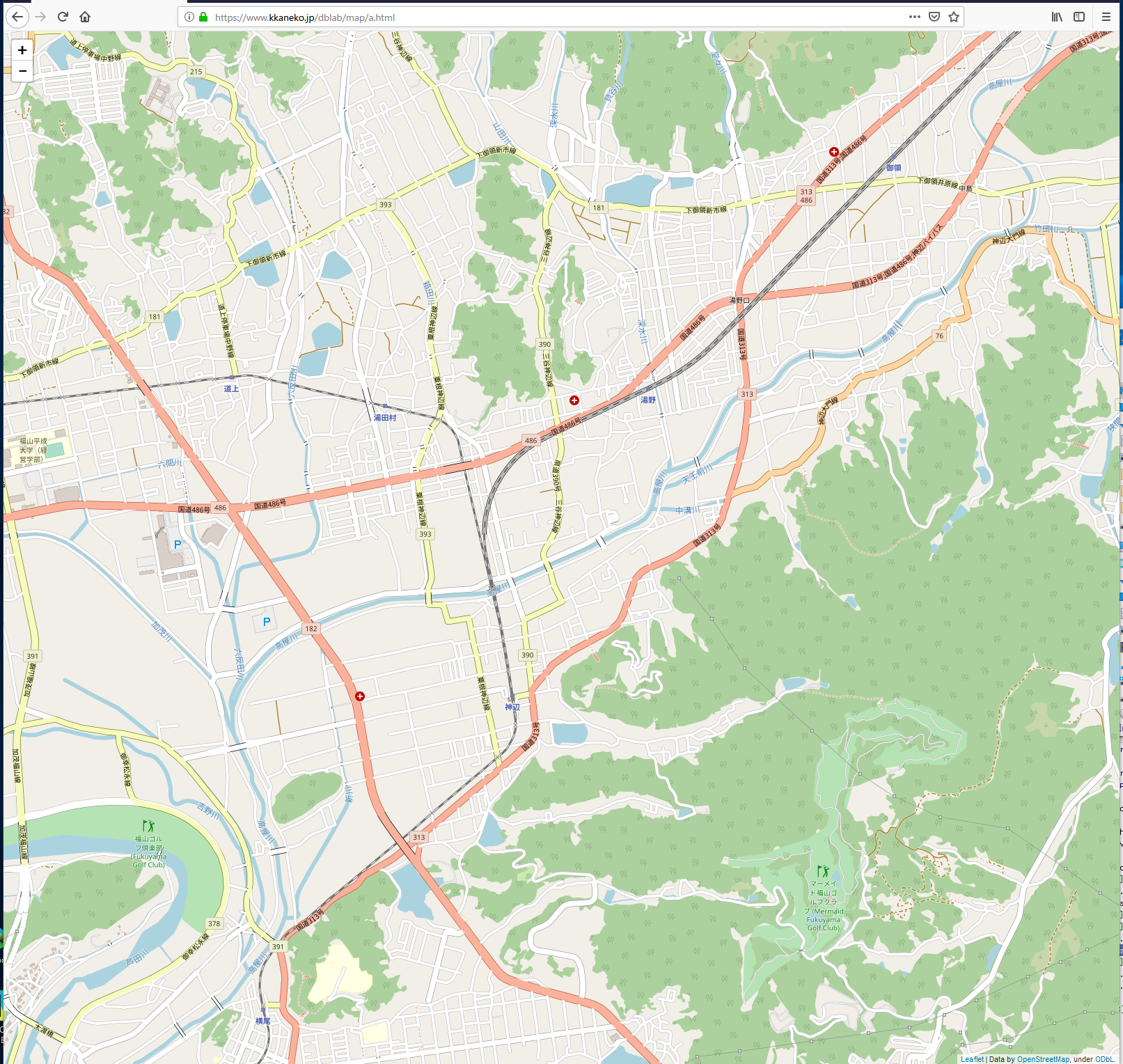 実行すると,カレントディレクトリに HTML ファイル(例:a.html)が生成される.生成された HTML ファイルをウェブブラウザで開くと地図が表示される.