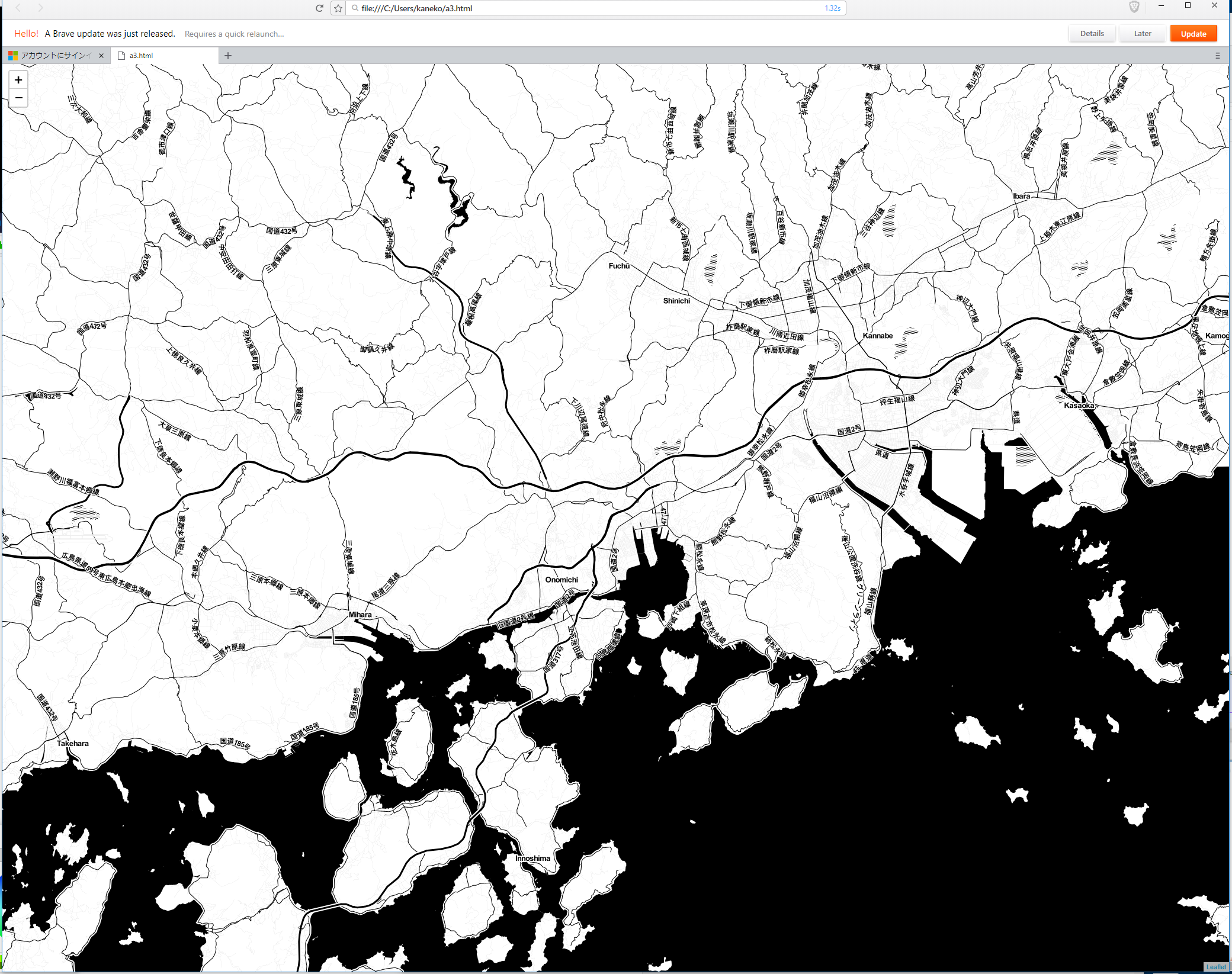 - a3.html をウェブブラウザで開くと,暗い配色の地図が表示される