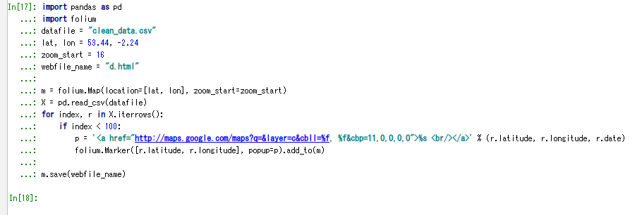 CSV 形式のデータファイル(clean_data.csv)から緯度・経度・日付を読み取り,OpenStreetMap 上にマーカーを配置した HTML ファイル(d.html)を生成する。