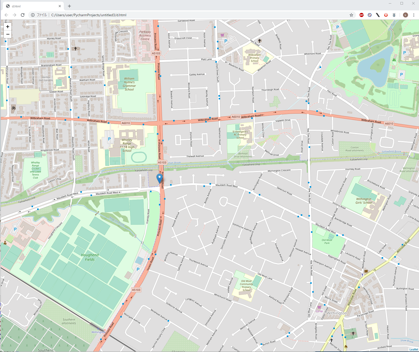 Python の folium ライブラリにより,OpenStreetMap 上にマーカーとポップアップ付きの地図を HTML ファイルとして生成できる。生成された HTML は Web ブラウザで表示でき,サーバー環境を必要としない。