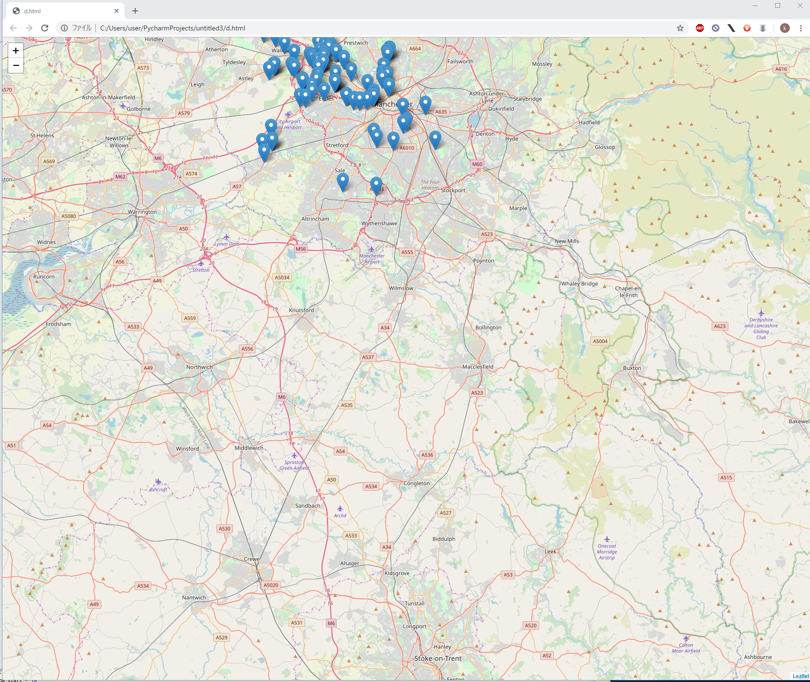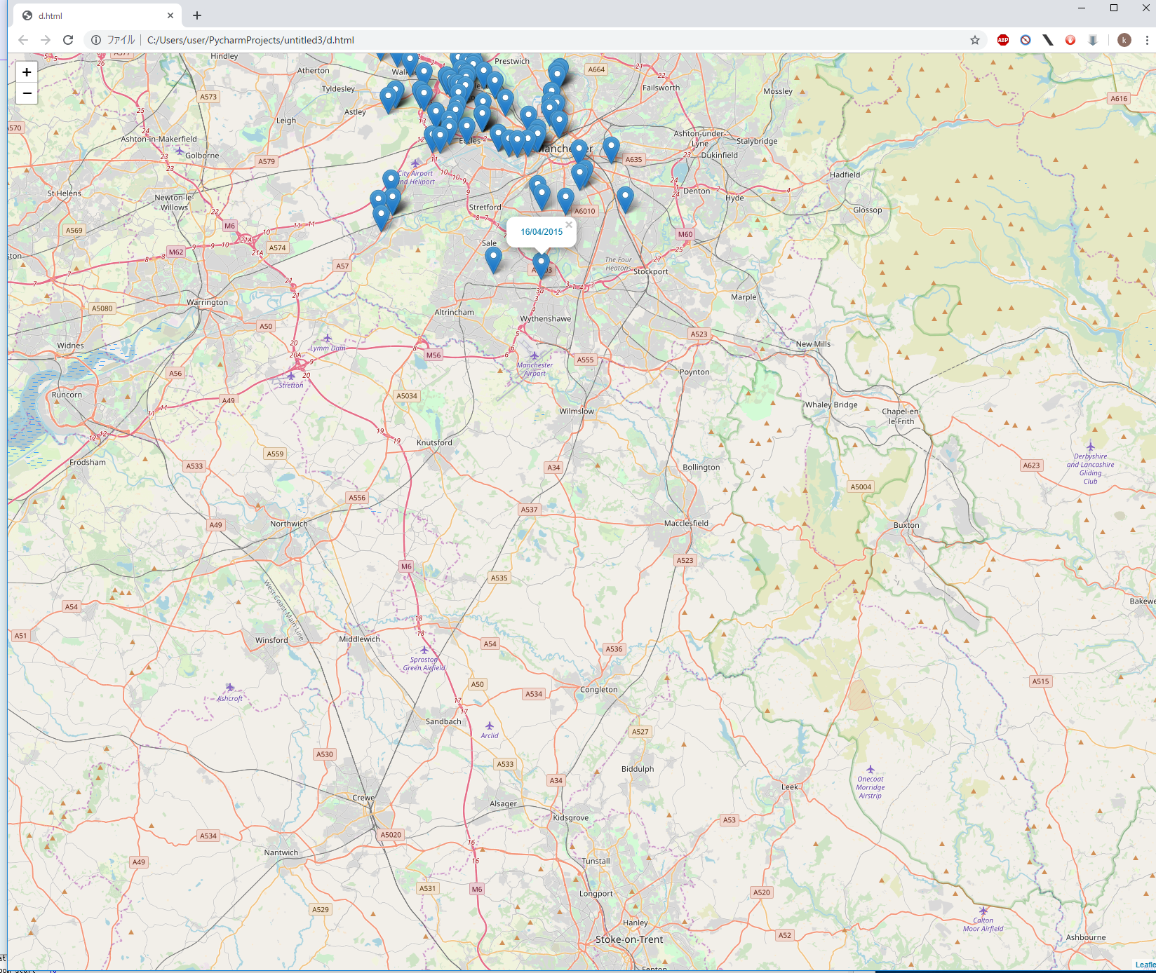 地図の初期表示位置は緯度 53.44,経度 -2.24,ズームレベル 16 である。データファイルの先頭100件がマーカーとして表示される。