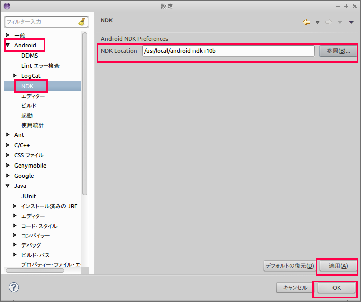 - 使用するAndroid NDK のディレクトリ: /usr/local/android-ndk-r10b