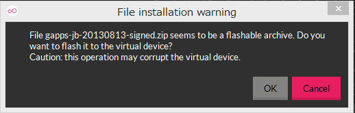 先ほどダウンロードした gapps-kk-... を Genymotion の仮想マシンの画面にドラッグ&ドロップ