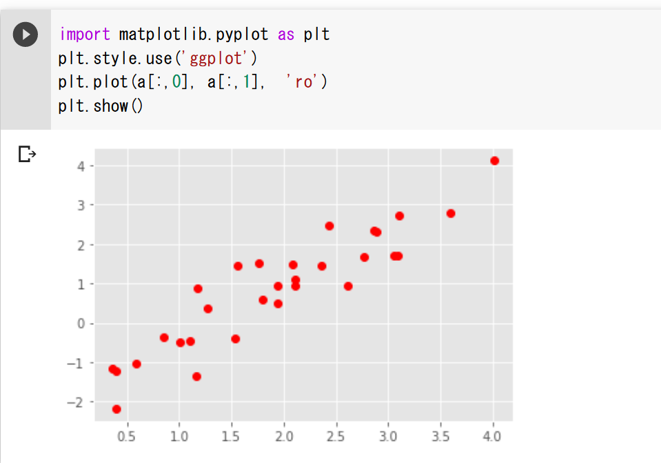 生成した 20 個のデータを plt.scatter で散布図としてプロットし,分布の形状を確認した。描画スタイルには ggplot を使用した。