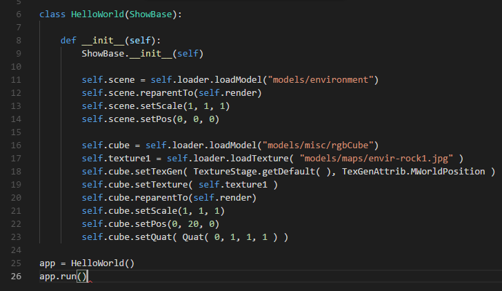from direct.showbase.ShowBase import ShowBase from direct.showbase.Loader import Loader from panda3d.core import Quat from panda3d.core import TextureStage, TexGenAttrib class HelloWorld(ShowBase): def __init__(self): ShowBase.__init__(self) self.scene = self.loader.loadModel("models/environment") self.scene.reparentTo(self.render) self.scene.setScale(1, 1, 1) self.scene.setPos(0, 0, 0) self.cube = self.loader.loadModel("models/misc/rgbCube") self.texture1 = self.loader.loadTexture( "models/maps/envir-rock1.jpg" ) self.cube.setTexGen( TextureStage.getDefault( ), TexGenAttrib.MWorldPosition ) self.cube.setTexture( self.texture1 ) self.cube.reparentTo(self.render) self.cube.setScale(1, 1, 1) self.cube.setPos(0, 20, 0) self.cube.setQuat( Quat( 0, 1, 1, 1 ) ) app = HelloWorld() app.run()