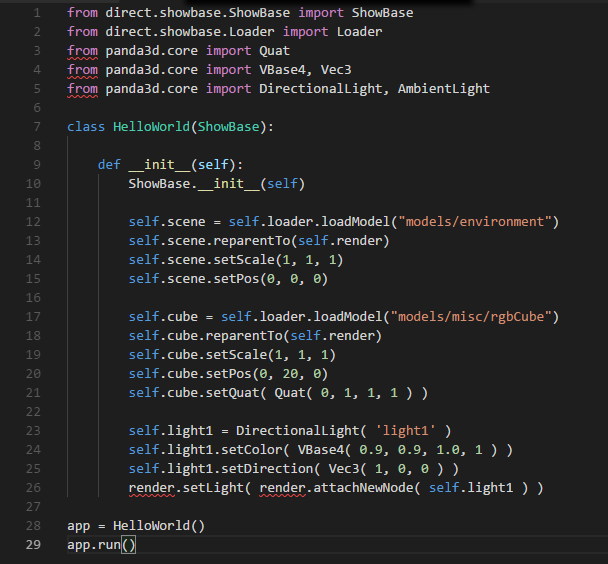 from direct.showbase.ShowBase import ShowBase from direct.showbase.Loader import Loader from panda3d.core import Quat from panda3d.core import VBase4, Vec3 from panda3d.core import DirectionalLight, AmbientLight class HelloWorld(ShowBase): def __init__(self): ShowBase.__init__(self) self.scene = self.loader.loadModel("models/environment") self.scene.reparentTo(self.render) self.scene.setScale(1, 1, 1) self.scene.setPos(0, 0, 0) self.cube = self.loader.loadModel("models/misc/rgbCube") self.cube.reparentTo(self.render) self.cube.setScale(1, 1, 1) self.cube.setPos(0, 20, 0) self.cube.setQuat( Quat( 0, 1, 1, 1 ) ) self.light1 = DirectionalLight( 'light1' ) self.light1.setColor( VBase4( 0.9, 0.9, 1.0, 1 ) ) self.light1.setDirection( Vec3( 1, 0, 0 ) ) render.setLight( render.attachNewNode( self.light1 ) ) app = HelloWorld() app.run()