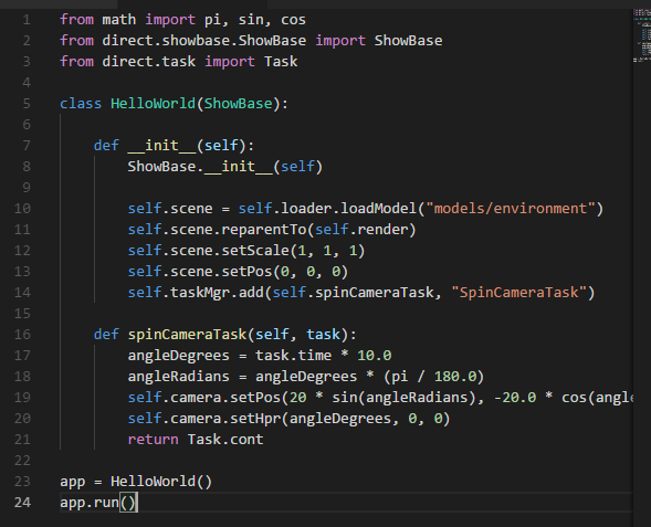 from math import pi, sin, cos from direct.showbase.ShowBase import ShowBase from direct.showbase.Loader import Loader from panda3d.core import Quat from direct.task import Task class HelloWorld(ShowBase): def __init__(self): ShowBase.__init__(self) self.scene = self.loader.loadModel("models/environment") self.scene.reparentTo(self.render) self.scene.setScale(1, 1, 1) self.scene.setPos(0, 0, 0) self.taskMgr.add(self.spinCameraTask, "SpinCameraTask") def spinCameraTask(self, task): angleDegrees = task.time * 10.0 angleRadians = angleDegrees * (pi / 180.0) self.camera.setPos(20 * sin(angleRadians), -20.0 * cos(angleRadians), 3) self.camera.setHpr(angleDegrees, 0, 0) return Task.cont app = HelloWorld() app.run()