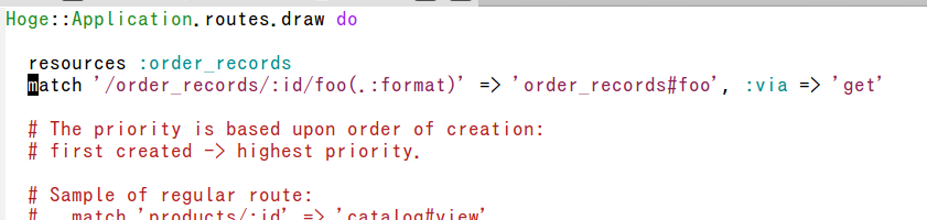 # GET /order_records/1/foo # GET /order_records/1/foo.json def foo @order_record = OrderRecord.find(params[:id]) respond_to do |format| p format format.html # foo.html.erb format.json { head :ok } end end◆エディタの画面