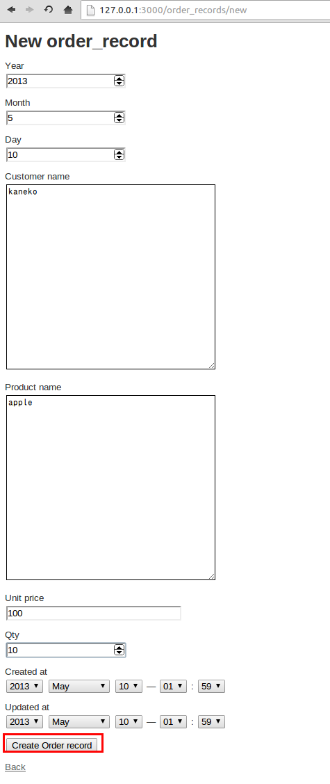 cd hoge rails generate scaffold order_record year:integer month:integer day:integer customer_name:text product_name:text unit_price:float qty:integer created_at:timestamp updated_at:timestamp