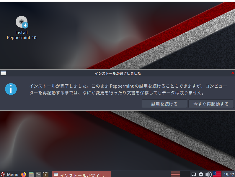 - デスクトップの「Install Peppermint 10」をダブルクリックして実行