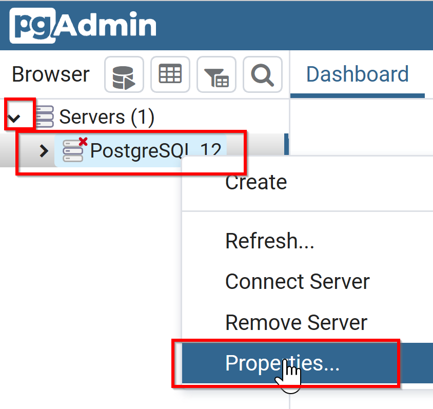 - オブジェクトブラウザで,PostgreSQL 12.0 (localhost:5432) を右クリックし,「Properties (プロパティ)」を選択する.