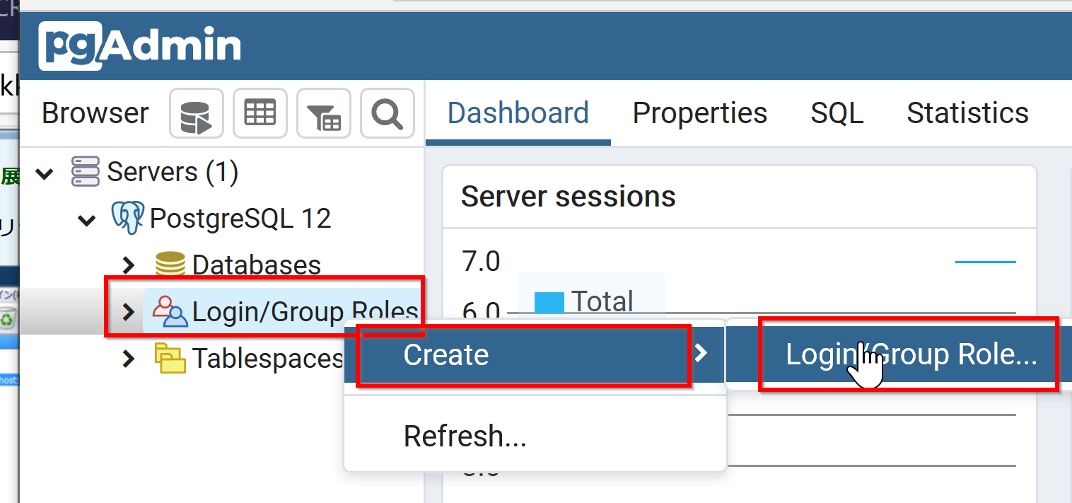 - 「Login/Group (ログイン/グループロール)」を右クリックし,「Create」から「Login/Group Role...」を選択する.
