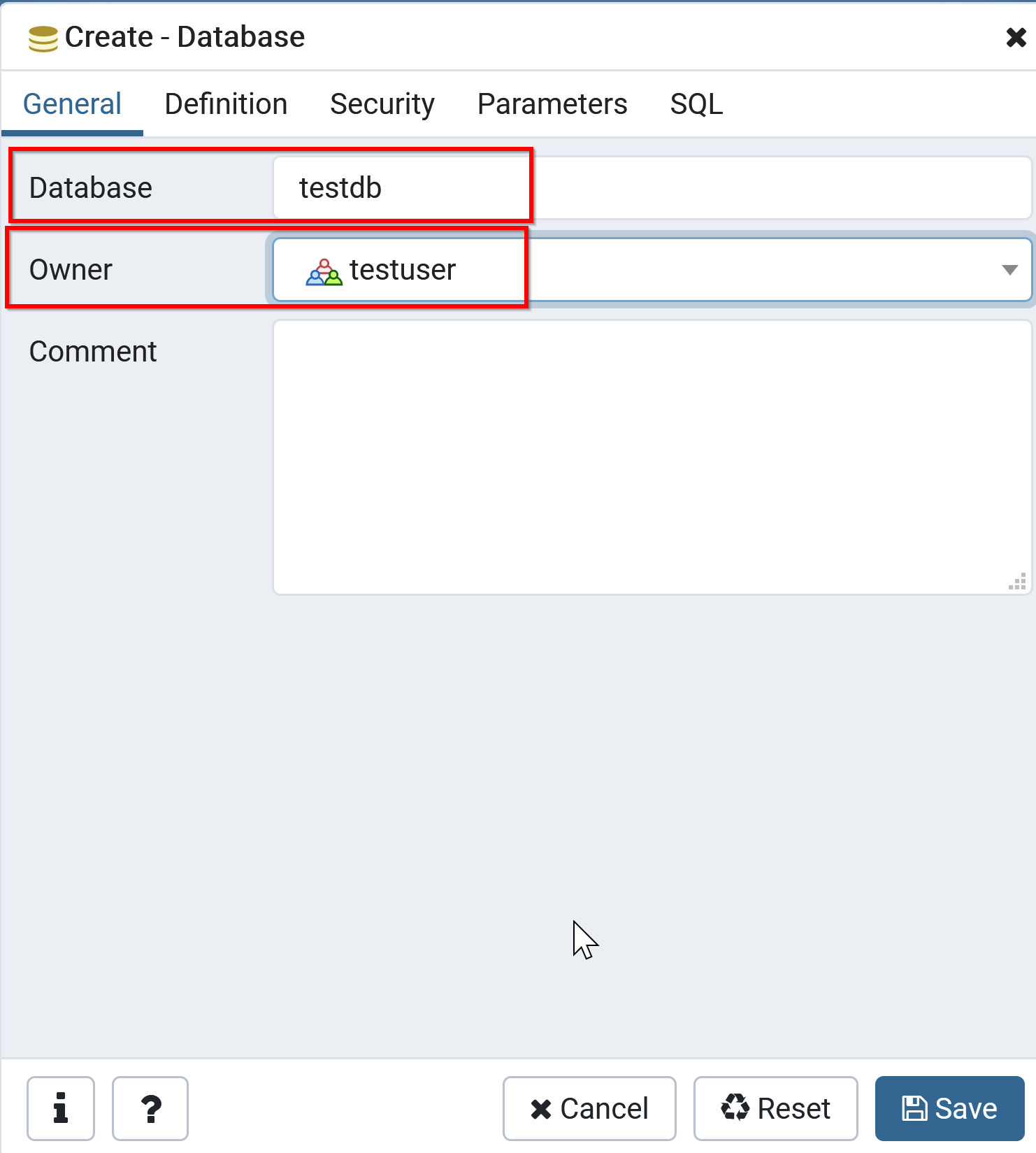 以下の例では,データベース名を testdb,オーナーを testuser,漢字コード(エンコーディング)を UTF8 として設定する.
