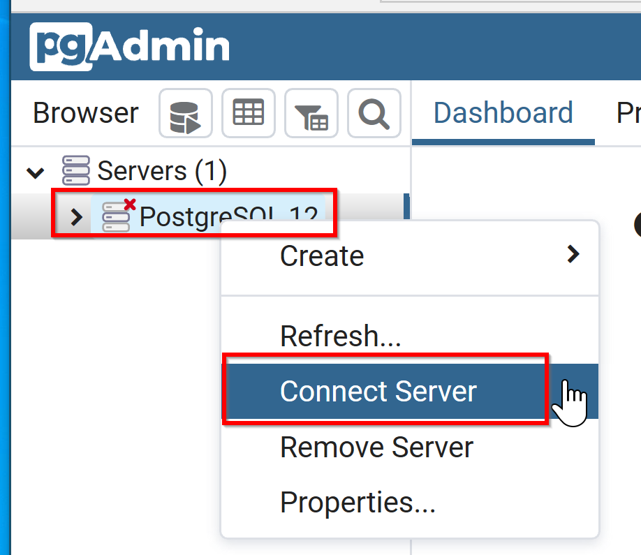 - PostgreSQL 12 を右クリックし,「Connect Server (接続)」を選択する.