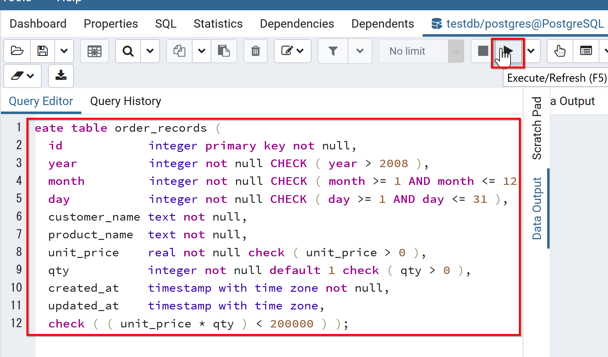 create table order_records ( id integer primary key not null, year integer not null CHECK ( year > 2008 ), month integer not null CHECK ( month >= 1 AND month <= 12 ), day integer not null CHECK ( day >= 1 AND day <= 31 ), customer_name text not null, product_name text not null, unit_price real not null check ( unit_price > 0 ), qty integer not null default 1 check ( qty > 0 ), created_at timestamp with time zone not null, updated_at timestamp with time zone, check ( ( unit_price * qty ) < 200000 ) );