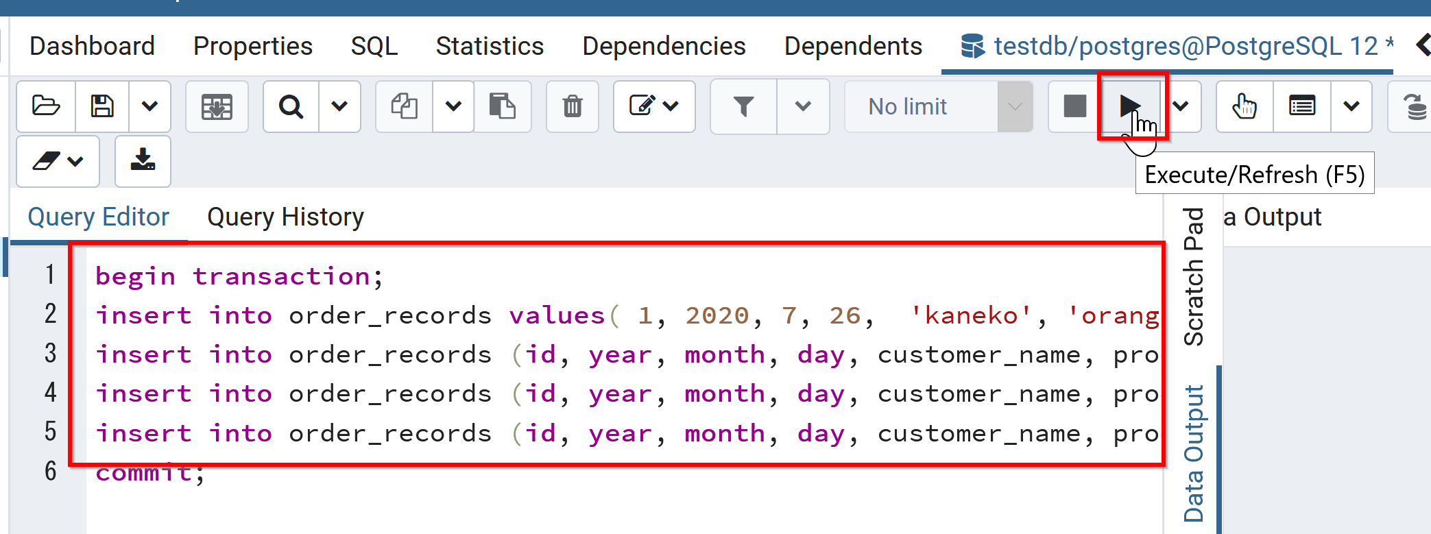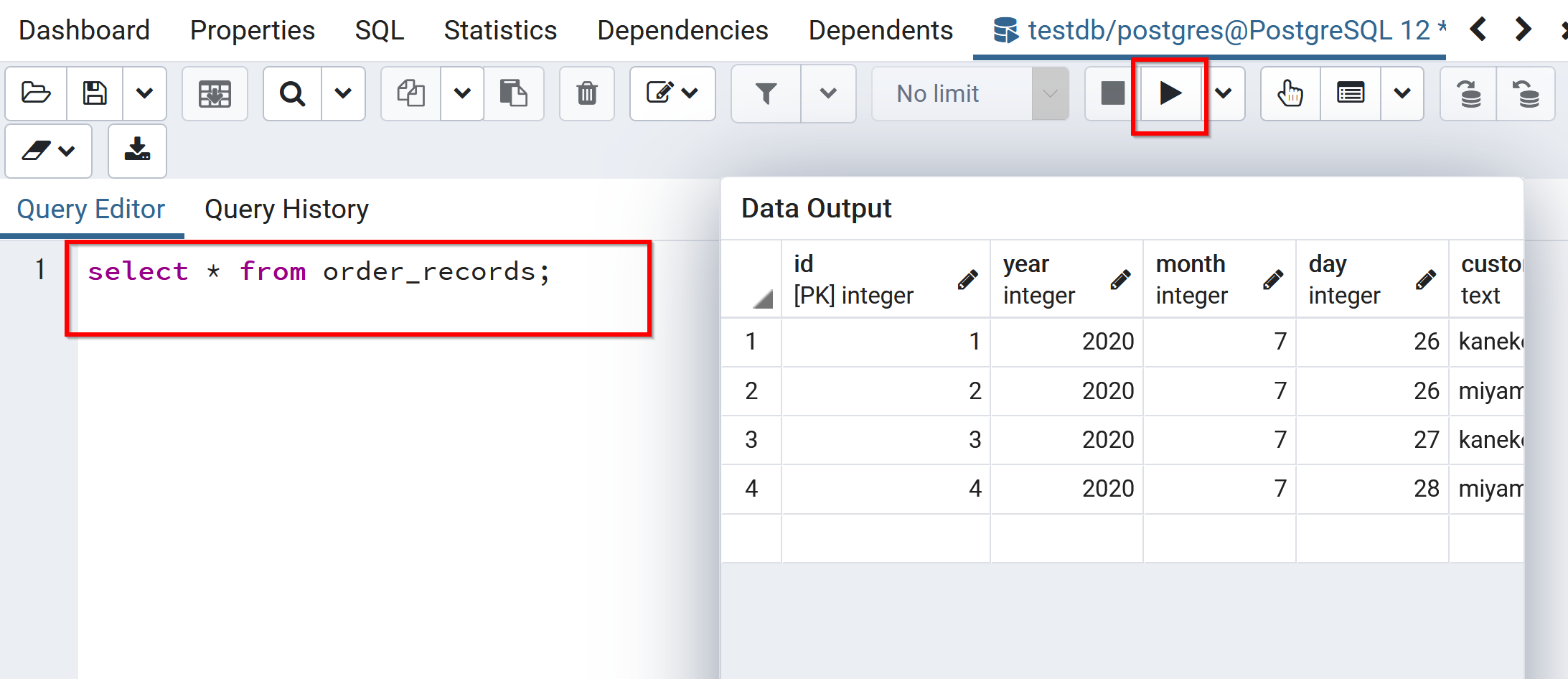 begin transaction; insert into order_records (id, year, month, day, customer_name, product_name, unit_price, qty) values( 1, 2023, 7, 26, 'kaneko', 'orange A', 1.2, 10 ); insert into order_records (id, year, month, day, customer_name, product_name, unit_price, qty) values( 2, 2023, 7, 26, 'miyamoto', 'Apple M', 2.5, 2 ); insert into order_records (id, year, month, day, customer_name, product_name, unit_price, qty) values( 3, 2023, 7, 27, 'kaneko', 'orange B', 1.2, 8 ); insert into order_records (id, year, month, day, customer_name, product_name, unit_price) values( 4, 2023, 7, 28, 'miyamoto', 'Apple L', 3 ); commit;