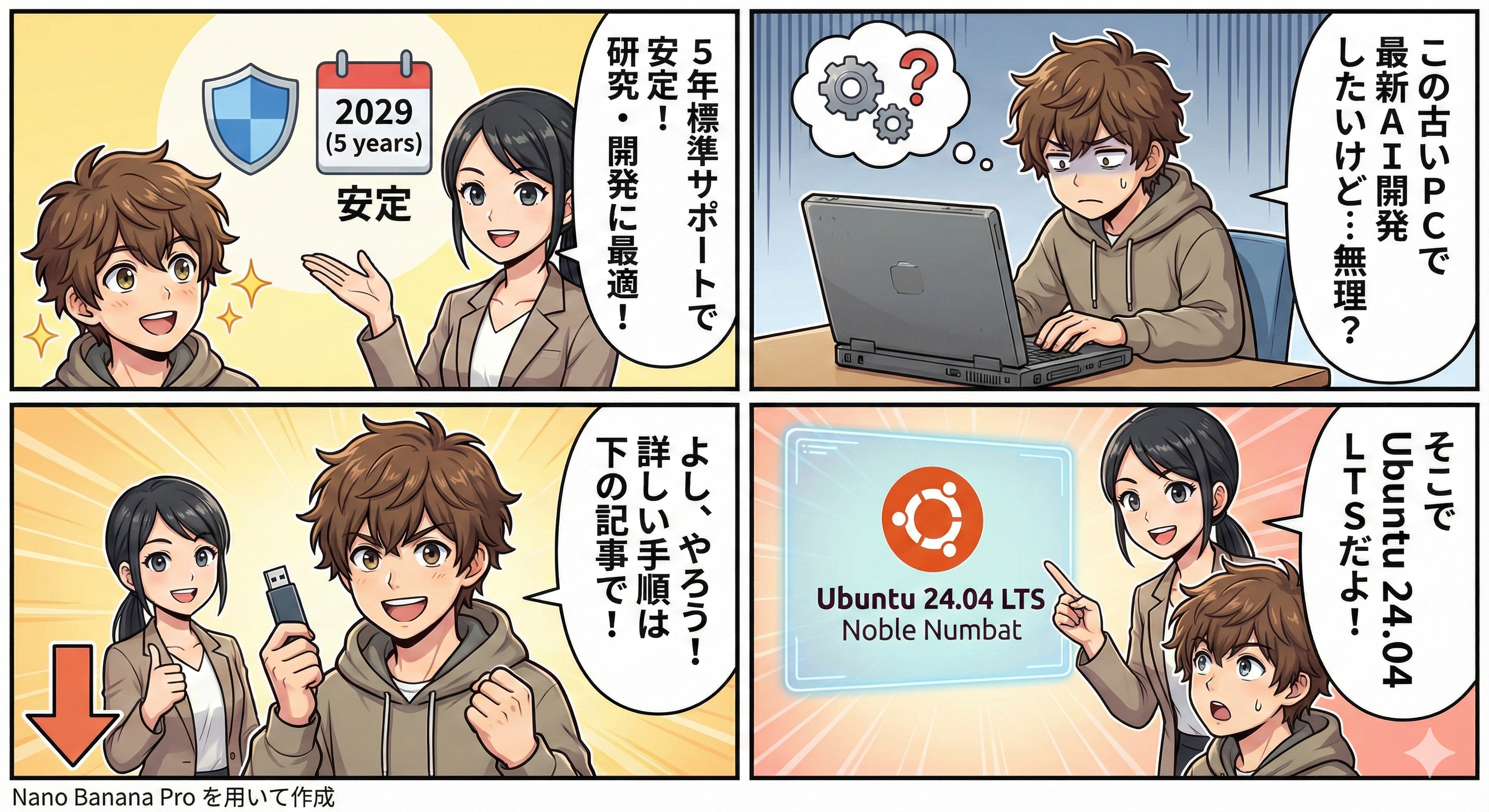 - サポート期間: 標準セキュリティ保守2029年4月まで(5年間)、Ubuntu Proにより拡張セキュリティ保守2034年4月まで(10年間)