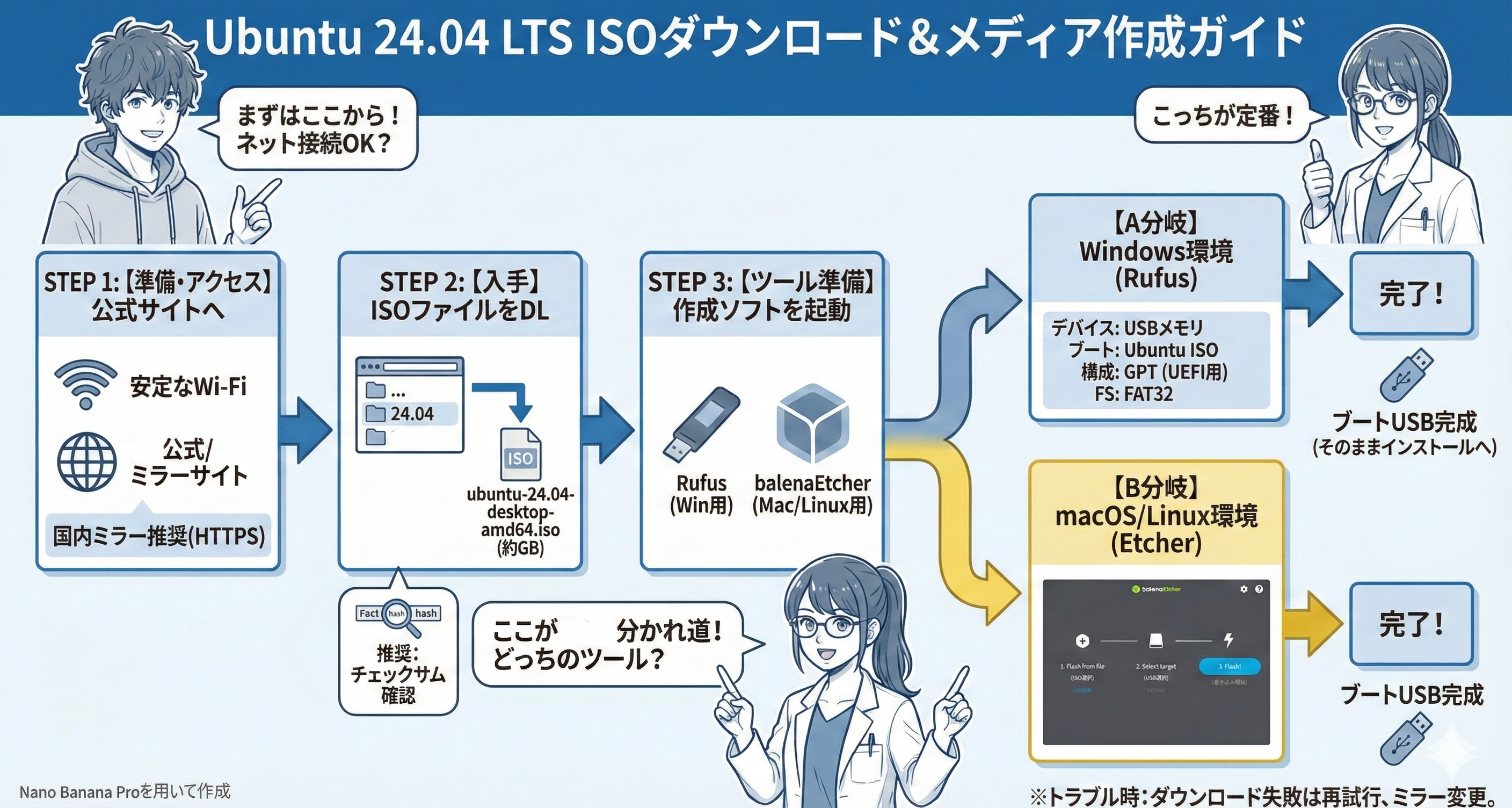 - Ubuntu 24.04のダウンロードとインストールメディアの作成