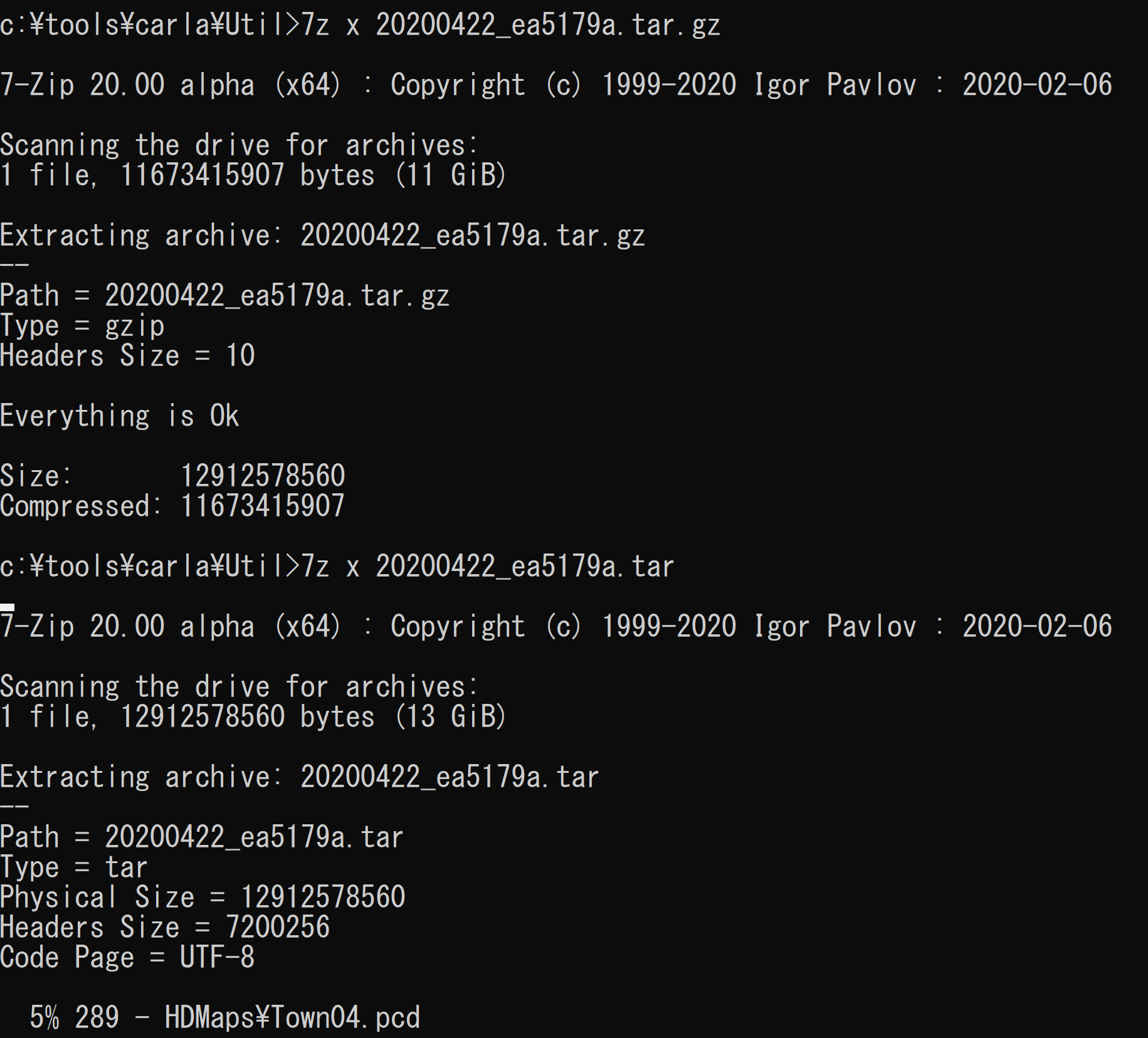 cd c:\tools\carla cd 20210730_564bcdc cd Unreal\CarlaUE4 mkdir Content cd Content mkdir Carla "c:\Program Files\7-Zip\7z.exe" x c:\tools\20200422_ea5179a.tar