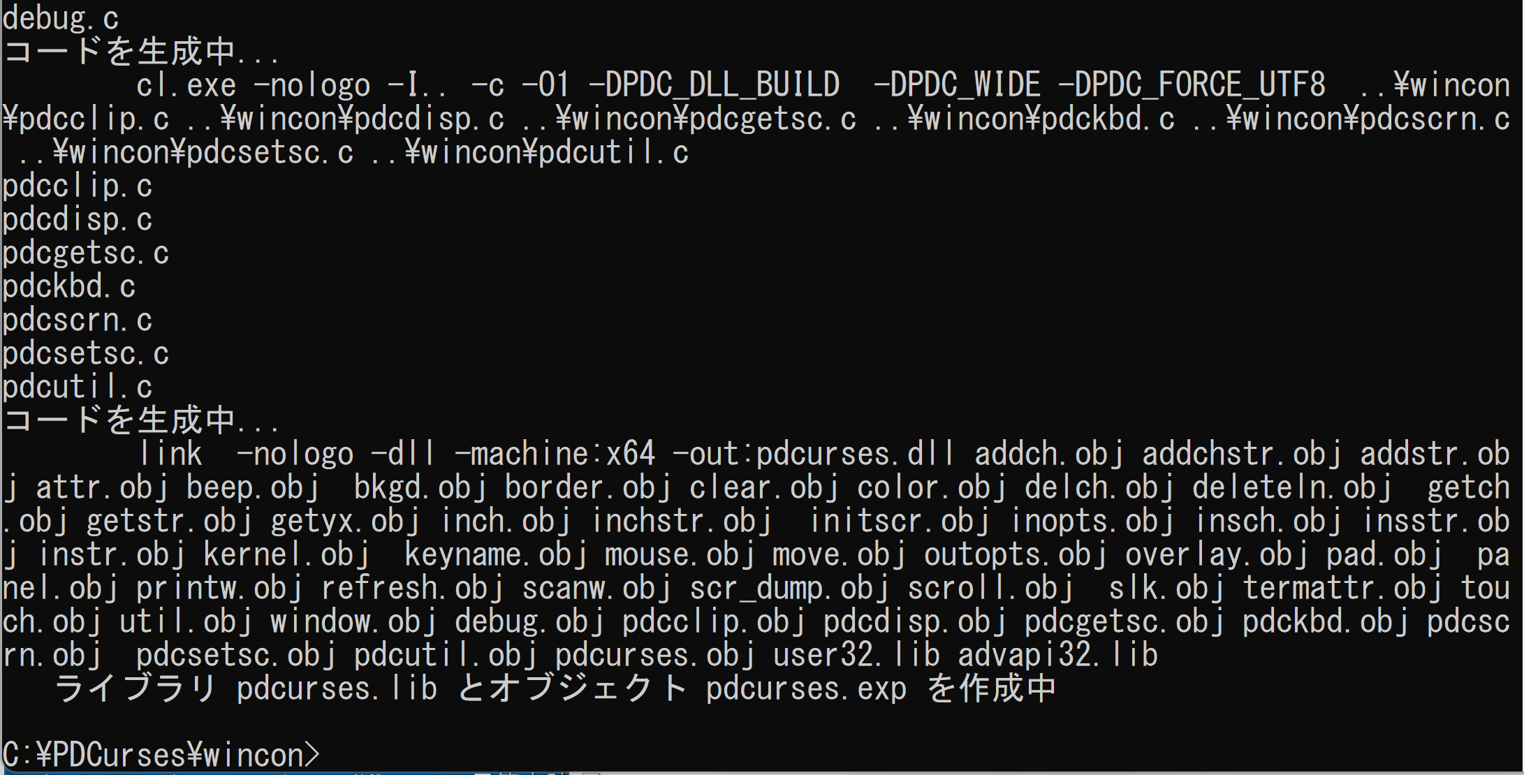 PDCursesはGUI開発用ライブラリ.GitHubからクローン後,Visual StudioのコマンドプロンプトでWIDE,UTF8,DLLオプションを有効にしてビルド.