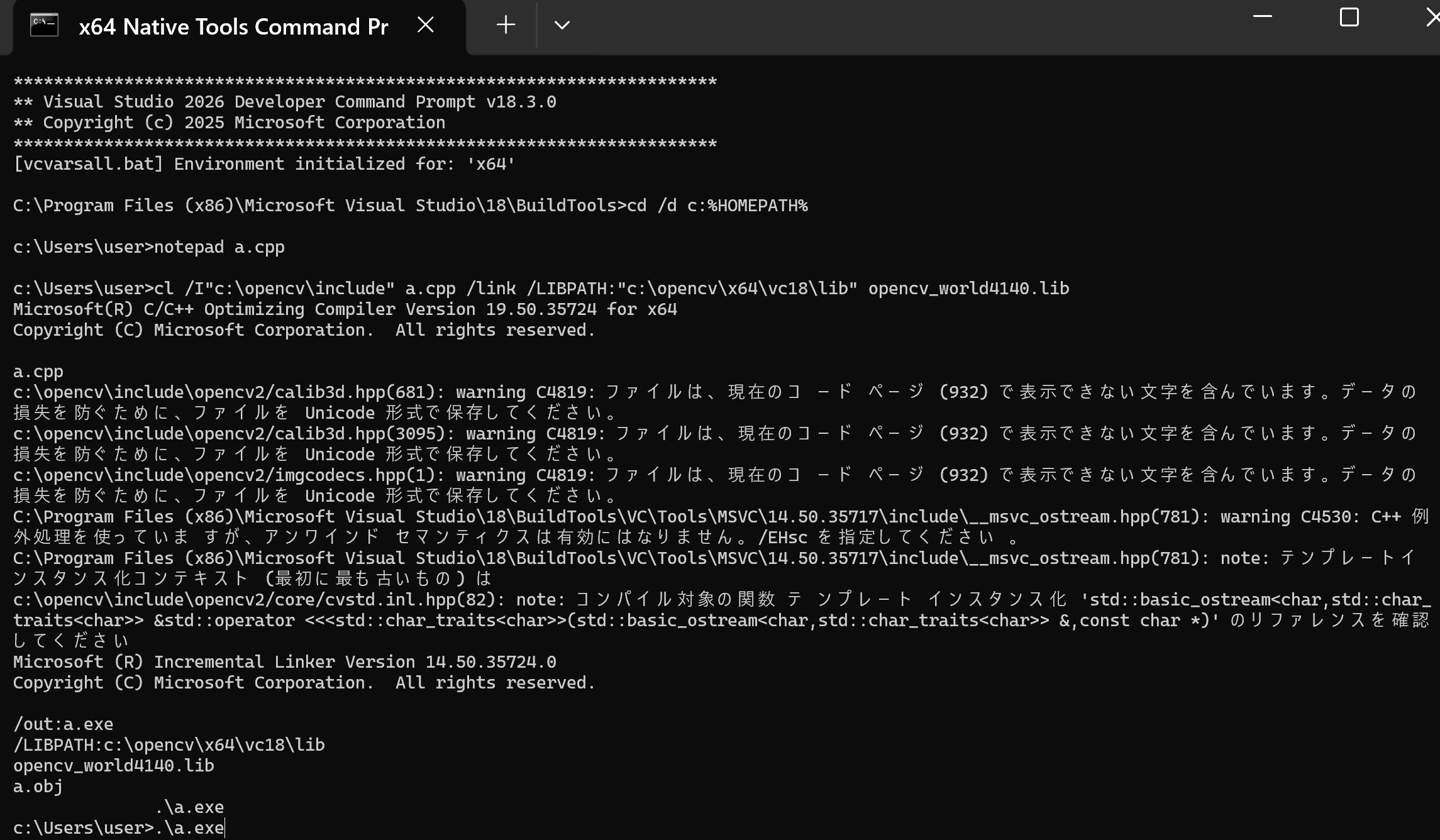 cl /I"c:\opencv\include" a.cpp /link /LIBPATH:"c:\opencv\x64\vc18\lib" opencv_world4140.lib .\a.exe