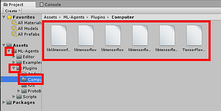 Unity のプロジェクトの画面で、 「Assets」 →「ML-Agents」 →「Plugins」 →「Computer」のディレクトリに、TensorFlow のファイルがあるのを確認する